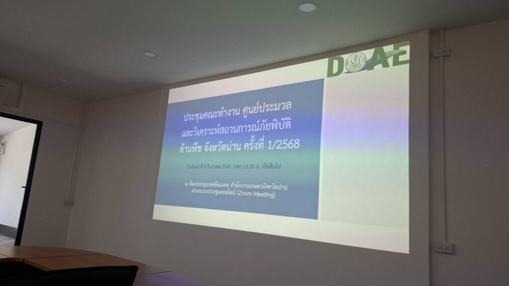 สำนักงานเกษตรจังหวัดน่าน จัดประชุมคณะทำงานศูนย์ประมวลและวิเคราะห์สถานการณ์ภัยพิบัติด้านพืช จังหวัดน่าน ครั้งที่ 1/2568 เวลา 13.30 น. ณ ห้องประชุมเทพชัยมงคล สำนักงานเกษตรจังหวัดน่าน ผ่านระบบการประชุมออนไลน์ (Zoom Meeting) โดยมีนายศักดิ์สิทธิ์ ศรีวิชัย เกษตรจังหวัดน่าน เป็นประธาน