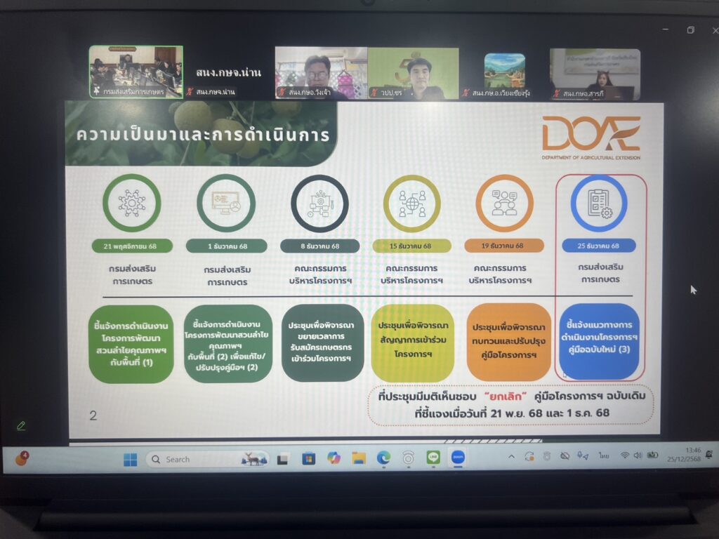 นายศักดิ์สิทธิ์ ศรีวิชัย เกษตรจังหวัดน่าน มอบหมายให้นายจักรพันธ์ อินไสย หัวหน้ากลุ่มส่งเสริมและพัฒนาการผลิต และเจ้าหน้าที่ ร่วมประชุมชี้แจงแนวทางการดำเนินงาน โครงการพัฒนาสวนลำไยคุณภาพ ตัดแต่งทรงพุ่ม/ช่อผล ฟื้นฟูสวนลำไย เพื่อเพิ่มรายได้(คู่มือฉบับใหม่) และรายงานผลการดำเนินงานโครงการฯ ณ ห้องประชุมเทพชัยมงคล สำนักงานเกษตรจังหวัดน่าน