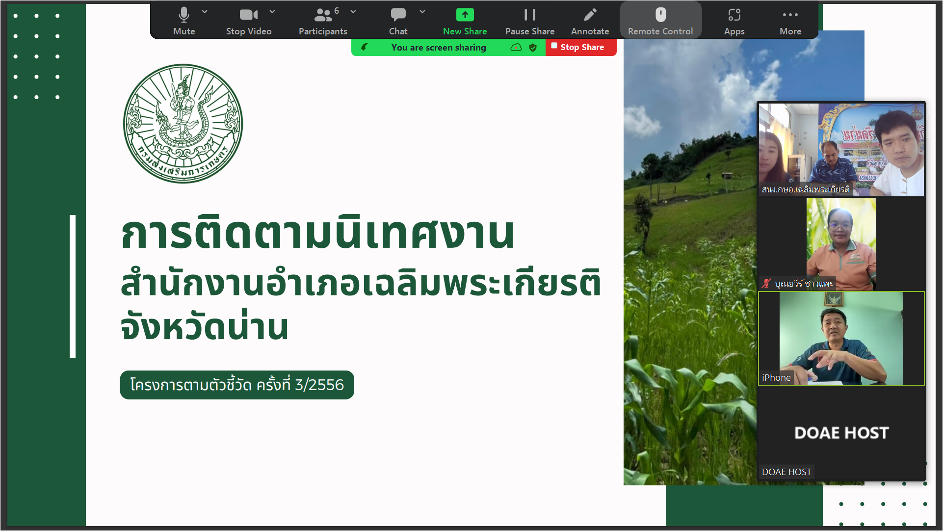 นายสันติ มณีอ่อน เกษตรอำเภอเฉลิมพระเกียรติ พร้อมด้วยเจ้าหน้าที่สำนักงานเกษตรอำเภอเฉลิมพระเกียรติ รับการนิเทศงานจากสำนักงานเกษตรจังหวัดน่าน ผ่านทางระบบออนไลน์ Zoom meeting นำโดยนายจักรพันธ์ อินไสย หัวหน้ากลุ่มส่งเสริมและพัฒนาการผลิต พร้อมคณะ เพื่อรายงานผลการดำเนินงาน ปัญหาและอุปสรรคในการดำเนินงานในพื้นที่อำเภอเฉลิมพระเกียรติ พร้อมรับฟังคำชี้แนะจากคณะนิเทศงาน ณ ห้องประชุมที่ว่าการอำเภอเฉลิมพระเกียรติ ชั้น 2 อำเภอเฉลิมพระเกียรติ จังหวัดน่าน