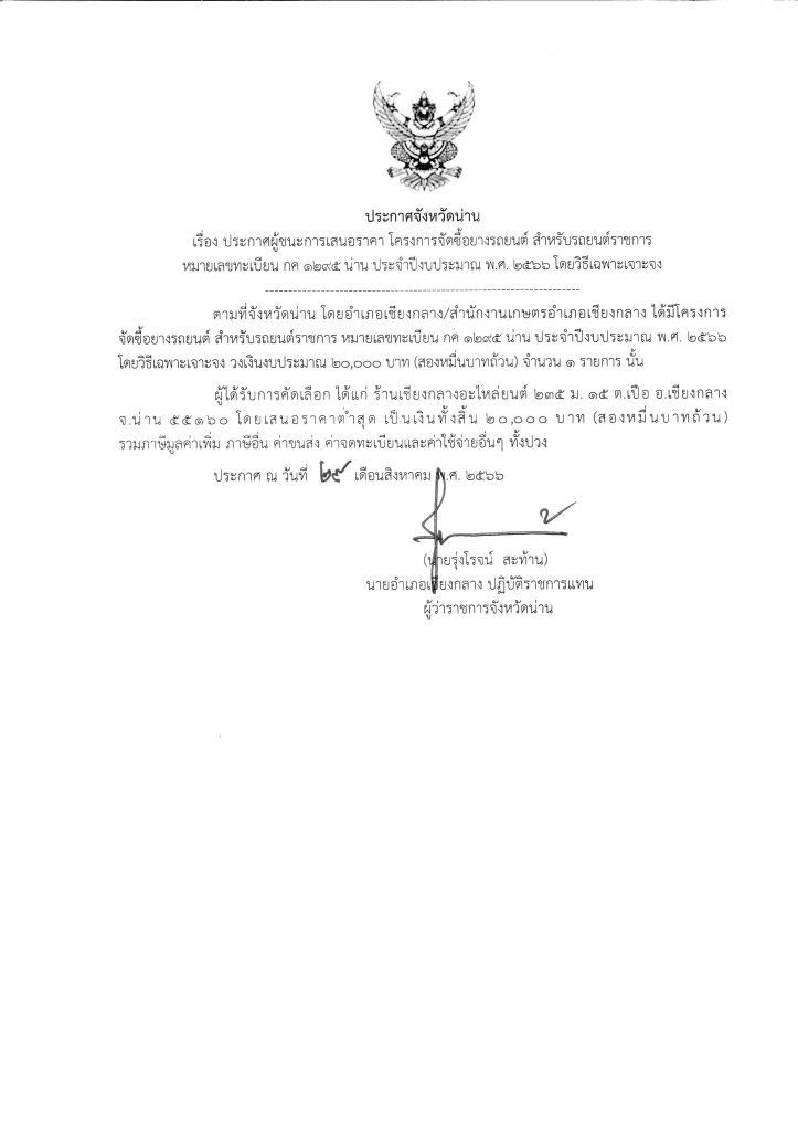 แนะแนวเรื่อง ประกาศจังหวัดน่าน เรื่อง ประกาศผู้ชนะการเสนอราคา สำหรับซื้อวัสดุสำนักงานและวัสดุคอมพิวเตอร์ สำหรับการดำเนินงานขึ้นทะเบียนและปรับปรุงข้อมูลทะเบียนเกษตรกรฯ โดยวิธีเฉพาะเจาะจง ประกาศจังหวัดน่าน เรื่อง ประกาศผู้ชนะการเสนอราคา สำหรับงานจ้างเหมาซ่อมแซมบำรุงรักษารถยนต์ราชการ หมายเลขทะเบียน กค 1295 น่าน โดยวิธีเฉพาะเจาะจง
