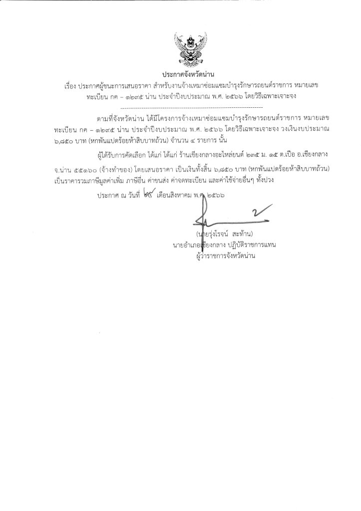แนะแนวเรื่อง ประกาศจังหวัดน่าน เรื่อง ประกาศผู้ชนะการเสนอราคา โครงการจัดซื้อยางรถยนต์ สำหรับรถยนต์ราชการ หมายเลขทะเบียน กค 1295 น่าน โดยวิธีเฉพาะเจาะจง การประกาศรายละเอียดข้อมูลราคากลางสำหรับโครงการจ้างเหมาปรับปรุงสำนักงานเกษตรอำเภอเชียงกลาง ตำบลเชียงกลาง อำเภอเชียงกลาง จังหวัดน่าน