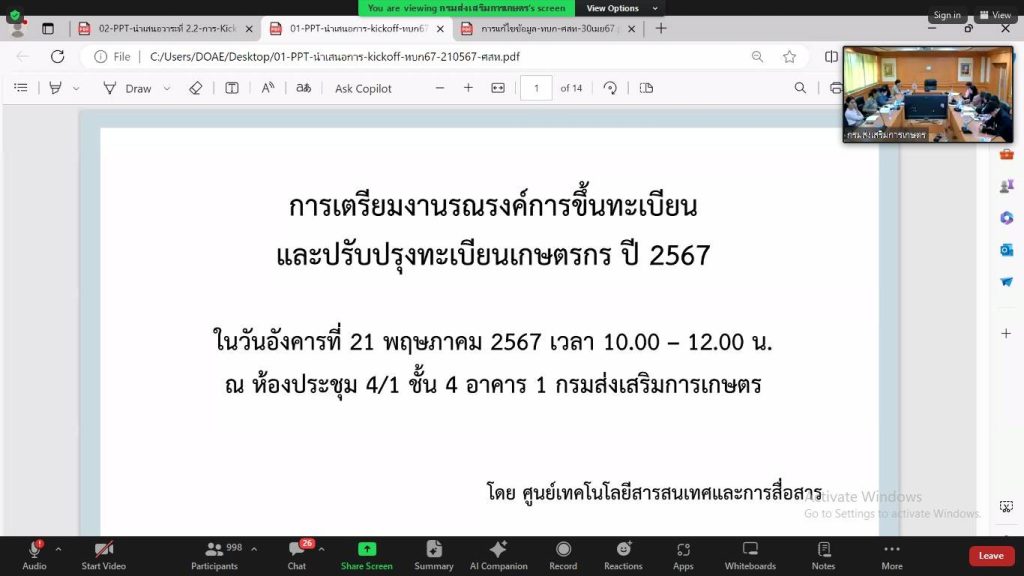 วันที่ 21 พฤษภาคม 2567 เวลา 10.00 น. นายเรวัต พรมสาส์น เกษตรอำเภอเชียงกลาง มอบหมายให้นางสาวปิยรัตน์ ธีราธรรม นักวิชาการส่งเสริมการเกษตรปฏิบัติการ ร่วมรับฟังการประชุมชี้แจงเตรียมความพร้อมโครงการรณรงค์การขึ้นทะเบียนและปรับปรุงทะเบียนเกษตรกร ปี 2567 ผ่านระบบออนไลน์ Application Zoom ณ สำนักงานเกษตรอำเภอเชียงกลาง จังหวัดน่าน เพื่อรณรงค์การขึ้นทะเบียนและปรับปรุงทะเบียนเกษตรกรให้เป็นปัจจุบันในทุกระดับ สร้างการรับรู้ และประชาสัมพันธ์ให้เกษตรกรเห็นถึงประโยชน์ของการขึ้นทะเบียนและปรับปรุงทะเบียนเกษตรกร พัฒนาคุณภาพชีวิตความเป็นอยู่ของเกษตรกรให้ดียิ่งขึ้น