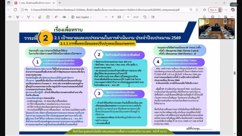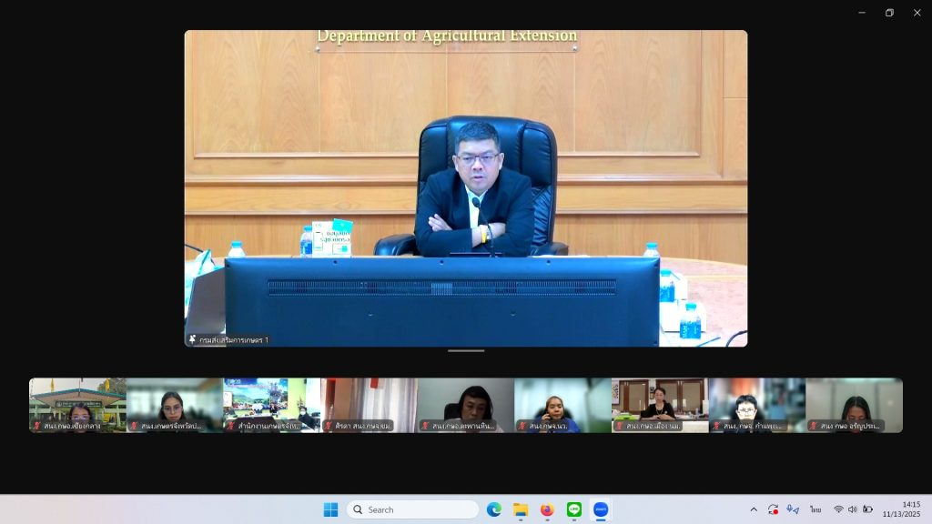 วันที่ 13 พฤศจิกายน 2568 เวลา 13.30 น. นายเรวัต พรมสาส์น เกษตรอำเภอเชียงกลาง มอบหมายให้ นางสาวปิยรัตน์ ธีราธรรม นักวิชาการส่งเสริมการเกษตรปฏิบัติการ เข้าร่วมรับฟังการชี้แจง โครงการขึ้นทะเบียนเกษตรกรและบริหารการจัดการสารสนเทศด้านพืช ประจำปีงบประมาณ 2569 ผ่านระบบประชุมออนไลน์ Zoom Meeting ณ สำนักงานเกษตรอำเภอเชียงกลาง จังหวัดน่าน โดยมีนายครองศักดิ์ สงรักษา รองอธิบดีกรมส่งเสริมการเกษตร เป็นประธานในการประชุม