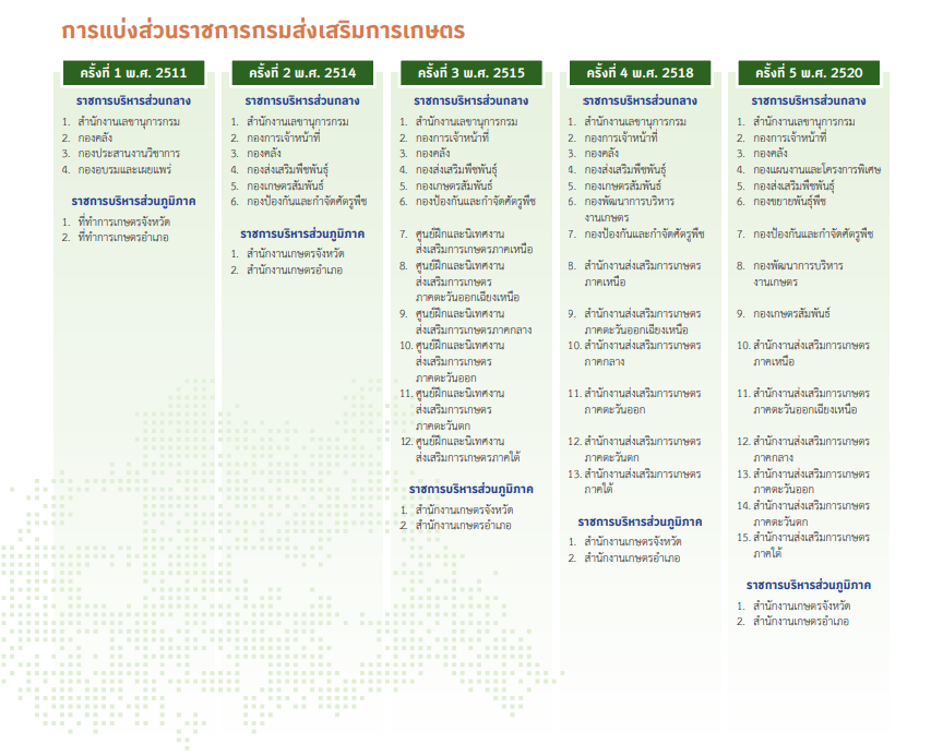 ราชการบริหารส่วนกลาง มี 4 หน่วยงาน ได้แก่ สำนักงานเลขานุการกรม กองคลัง กองประสานงานวิชาการเกษตร กองอบรมและเผยแพร่ ราชการบริหารส่วนภูมิภาคมี 2 หน่วยงาน คือที่ทำการเกษตรจังหวัด และที่ทำการเกษตรอำเภอ โดยมีอัตรากำลังข้าราชการในระยะเริ่มตั้งกรมฯ จำนวน 1,726 คน