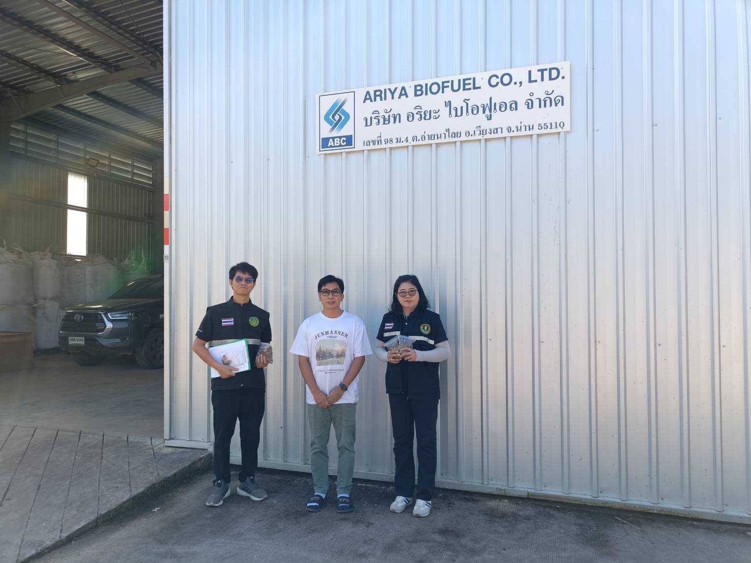 นายศักดิ์สิทธิ์ ศรีวิชัย เกษตรจังหวัดน่าน มอบหมายให้นางจีรพร ชัยเงิน หัวหน้ากลุ่มอารักขาพืช เก็บตัวอย่างเศษฝุ่นซึ่งเป็นผลพลอยได้จากกระบวนการผลิตชีวมวลอัดแท่งเพื่อนำไปวิเคราะห์ปริมาณธาตุอาหารที่จำเป็นต่อพืช เพื่อต่อยอดในการนำไปใช้ประโยชน์ด้านดินและปุ๋ย ณ บริษัท อริยะ ไบโอ ฟูเอล จำกัด บ้านใหม่เจริญราษฎร์ หมู่ที่ 4 ตำบลอ่ายนาไลย อำเภอเวียงสา จากนั้นลงพื้นที่ติดตามงานโครงการอันเนื่องมาจากพระราชดำริ โครงการทหารพันธุ์ดี เพื่อสำรวจโรคและแมลง และการดำเนินงานก่อสร้างฐานเรียนรู้ต้นแบบการผลิตขยายสารชีวภัณฑ์ ณ โครงการทหารพันธุ์ดี ฐานแสงเพ็ญ ตำบลฝายแก้ว อำเภอภูเพียง จังหวัดน่าน