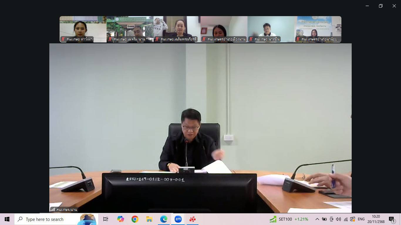 นายศักดิ์สิทธิ์ ศรีวิชัย เกษตรจังหวัดน่าน เป็นประธานการประชุมชี้แจงโครงการส่งเสริมการเกษตร ประจำปีงบประมาณ พ.ศ. 2569 (โครงการตามตัวชี้วัด) ครั้งที่ 1 โดยมีหัวหน้ากลุ่ม เกษตรอำเภอทุกอำเภอ เจ้าหน้าที่สำนักงานเกษตรจังหวัด และเจ้าหน้าที่สำนักงานเกษตรอำเภอ เข้าร่วมประชุม เพื่อให้การดำเนินการส่งเสริมการเกษตรในพื้นที่สำเร็จ ลุล่วง ตามเป้าหมายและวัตถุประสงค์ ผ่านระบบประชุมออนไลน์ Zoom Meeting ณ สำนักงานเกษตรจังหวัดน่าน ตำบลในเวียง อำเภอเมืองน่าน จังหวัดน่าน
