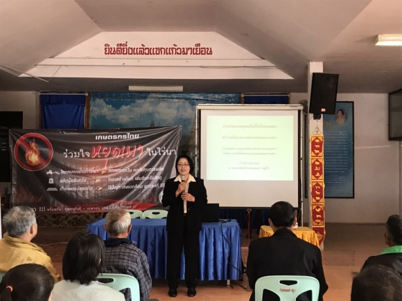 นางสาวประทิน มณีรัตน์ เกษตรอำเภอภูเพียง ชี้แจงวัตถุประสงค์โครงการ ส่งเสริมการหยุดเผาในพื้นที่การเกษตร ถ่ายทอดความรู้และพัฒนาศักยภาพเกษตรกร ให้สามารถเป็นวิทยากรเกษตรปลอดการเผา
