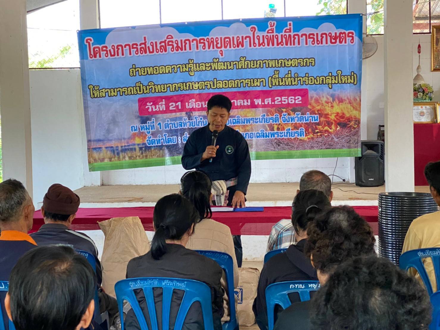 วันที่ 21 ธ.ค. 2562 นายสุขพสันต์ พรหมลังกา เกษตรอำเภอเฉลิมพระเกียรติ พร้อมด้วยเจ้าหน้าที่จากสำนักงานเกษตรอำเภอ จัดกิจกรรมโครงการส่งเสริมการหยุดเผาในพื้นที่เกษตร ถ่ายทอดความรู้และพัฒนาศักยภาพเกษตรกรให้สามารถเป็นวิทยากรปลอดการเผา (พื้นที่นำร่องกลุ่มใหม่) ปี 2563 มีเกษตรกรเข้าร่วม 87 ราย ณ หอประชุมบ้านห้วยโก๋น ม.1 ต.ห้วยโก๋น อ.เฉลิมพระเกียรติ จ.น่าน