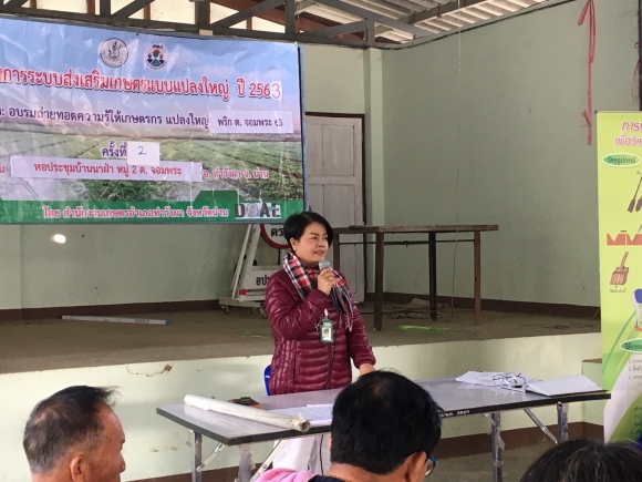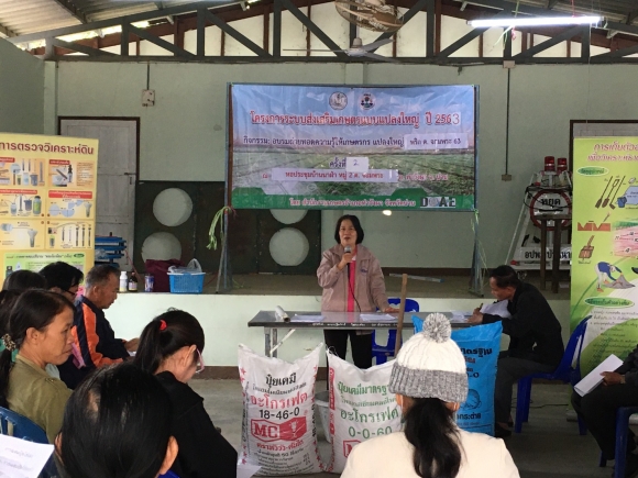 วันที่ 28 มกราคม 2563 นางอนงค์ ตันติตระการวัฒนา เกษตรอำเภอท่าวังผา พร้อมด้วยเจ้าหน้าที่สำนักงานเกษตรอำเภอท่าวังผา ดำเนินโครงการระบบส่งเสริมเกษตรแบบแปลงใหญ่ โดยได้ถ่ายทอดความรู้เรื่อง การตรวจวิเคราะห์ดิน เทคโนโลยีการใช้ปุ๋ยตามค่าวิเคราะห์ดิน การผสมแม่ปุ๋ยใช้เองให้แก่เกษตรกรแปลงใหญ่พริกบ้านนาฝ่า ครั้งที่ 2 ณ หอประชุมหมู่บ้านหมู่ 2 บ้านนาฝ่า ตำบลจอมพระ อำเภอท่าวังผา จังหวัดน่าน