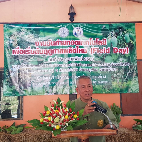 วันที่ 19 มกราคม 2563 เวลา 10.00 น. นายเศรณี อนิลบล เกษตรจังหวัดน่าน ร่วมพบปะเกษตรกรและเจ้าหน้าที่ในงานวันถ่ายทอดเทคโนโลยี เพื่อเริ่มต้นฤดูกาลผลิตใหม่ (Field Day) ของอำเภอภูเพียง ณ ศูนย์เรียนรู้การเพิ่มประสิทธิภาพการผลิตสินค้าเกษตร (ศพก.หลัก) ตำบลเมืองจัง อำเภอภูเพียง จังหวัดน่าน โดยได้กล่าวแนะนำตัวและแนวทางในการพัฒนาการเกษตรโดยการน้อมนําหลักปรัชญาเศรษฐกิจพอเพียง น้อมนำศาสตร์พระราชาสู่การปฏิบัติ ในการแก้ปัญหาเรื่องน้ำ ทั้งการทำหลุมขนมครก การทำธนาคารน้ำใต้ดินในครัวเรือน เพื่อกักเก็บในฤดูฝนไว้ใช้ฤดูแล้ง การแก้ไขปัญหาหมอกควันไฟป่า โดยการไถกลบหรือนำเศษพืชเศษวัสดุทางการเกษตรมาเพาะเห็ดสร้างรายได้หรือนำมาทำปุ๋ยหมักเพื่อใช้ในการผลิตพืชและบำรุงดิน และเนื่องจากเป็นห้วงประกาศงดเว้นการเผาโดยเด็ดขาดของจังหวัดน่าน ในห้วงวันที่ 15 กุมภาพันธ์ - 15 เมษายน 2563 ด้วย.