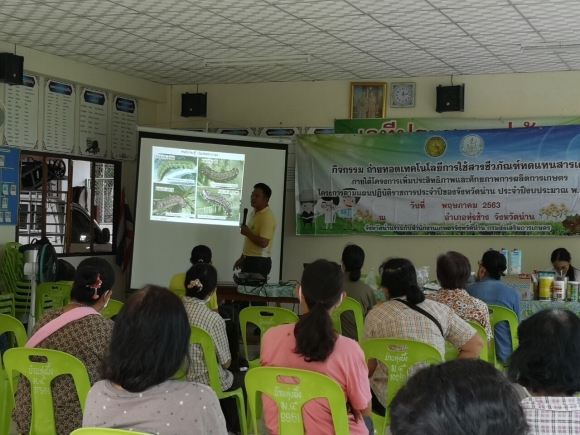 วันที่ 12 พฤษภาคม 2563 นายเศรณี อนิลบล เกษตรจังหวัดน่านมอบหมายให้ นายสุนทร วันหมื่น นักวิชาการส่งเสริมการเกษตรปฏิบัติการ นางสาวอชิรญา ทะนันไชย เจ้าหน้าที่โครงการฯนาย ปริญญา มารัตน์ เจ้าหน้าที่โครงการ ฯ สนง.เกษตรจังหวัดน่าน ร่วมกับสำนักงานเกษตรอำเภอทุ่งช้างจัดฝึกอบรมเกษตรกรที่เข้าร่วมโครงการเพิ่มประสิทธิภาพและศักยการผลิตการเกษตร (ภายใต้โครงการตามแผนปฎิบัติราชการประจำปีของจังหวัดน่าน ประจำปีงบประมาณ 2563 กิจกรรมหลัก พัฒนาการผลิตสินค้าเกษตรมีคุณภาพและปลอดภัยของจังหวัดน่าน กิจกรรมถ่ายทอดความรู้เทคโนโลยีการใช้สารชีวภัณฑ์ทดแทนสารเคมี โดยมีเกษตรกรเข้าร่วมอบรม จำนวน 40 ราย ณ บ้านทุ่งผึ้ง ตำบลทุ่งช้าง อำเภอทุ่งช้าง จังหวัดน่าน