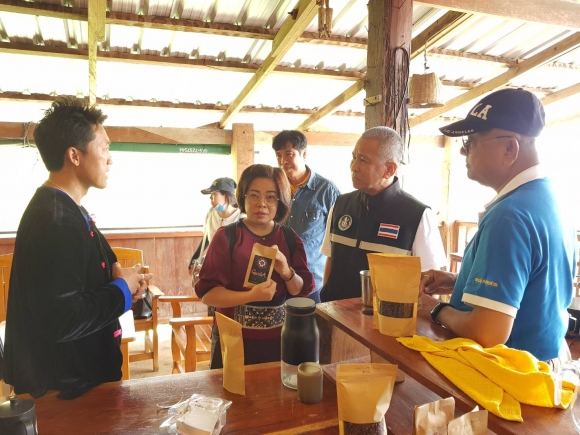 จุดที่ 1 สำนักบริหารพื้นที่อนุรักษ์พื้นที่ 13(5) บ้านมณีพฤกษ์ ตำบลงอบ อำเภอทุ่งช้าง จังหวัดน่าน มีนายประพันธ์ จันทร์ผง เกษตรอำเภอทุ่งช้าง และนายวิชัย กำเนิดมงคล ประธานแปลงใหญ่กาแฟบ้านมณีพฤกษ์ ร่วมตรวจชุดครุภัณฑ์แปรรูปกาแฟ นำชมผลิตภัณฑ์กาแฟและหารือแนวทางการพัฒนาการผลิตกาแฟของกลุ่ม โดยบ้านมณีพฤกษ์ มีพื้นปลูกกาแฟกว่า 1 พันไร่ สูงจากระดับน้ำทะเลกว่า 1 พันเมตร สามารถปลูกกาแฟสายพันธุ์คุณภาพทั้งสายพันธุ์กาแฟอาราบิก้า คาติมอร์ เกอิชา ฯลฯ ซึ่งชุดครุภัณฑ์แปรรูปกาแฟดังกล่าวจะทำให้กลุ่มสามารถแปรรูปผลผลิตกาแฟเชอรี่ได้ถึง 1,400 กิโลกรัม/ชั่วโมง การส่งเสริมขยายพื้นที่ปลูกกาแฟตามแนวทางสร้างป่าสร้างรายได้ การส่งเสริมการผลิตกาแฟมาตรฐานอินทรีย์ การแปรรูปผลผลิตกาแฟ ตลอดจนส่งเสริมการท่องเที่ยวเชิงเกษตรในพื้นที่