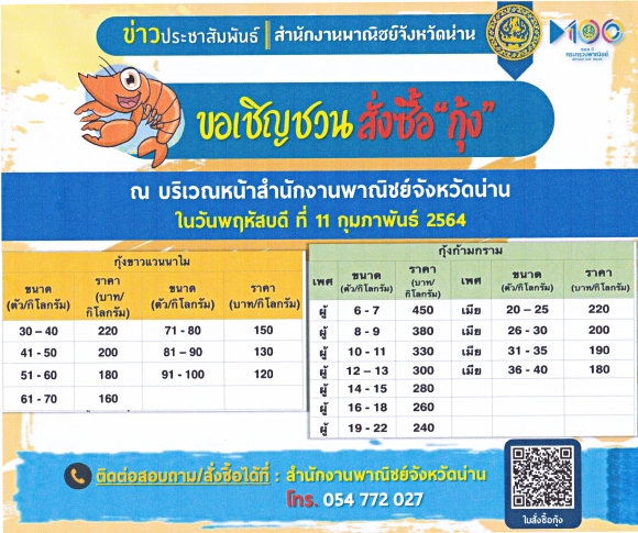 ขอเชิญชวนสั่งซื้อกุ้ง ณ บริเวณหน้าสำนักงานพาณิชย์จังหวัดน่าน