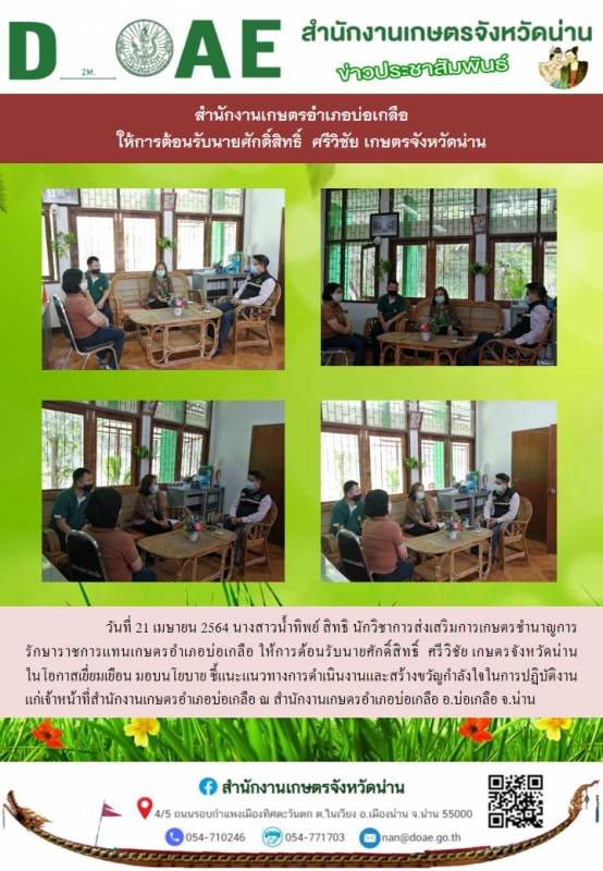 วันที่ 21 เมษายน 2564 นางสาวน้ำทิพย์ สิทธิ นักวิชาการส่งเสริมการเกษตรชำนาญการ รักษาราชการแทนเกษตรอำเภอบ่อเกลือ ให้การต้อนรับนายศักดิ์สิทธิ์ ศรีวิชัย เกษตรจังหวัดน่าน ในโอกาสเยี่ยมเยือน มอบนโยบาย ชี้แนะแนวทางการดำเนินงานและสร้างขวัญกำลังใจในการปฏิบัติงานแก่เจ้าหน้าที่สำนักงานเกษตรอำเภอบ่อเกลือ ณ สำนักงานเกษตรอำเภอบ่อเกลือ อ.บ่อเกลือ จ.น่าน