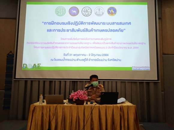วันที่ 31 พฤษภาคม 2564 นายศักดิ์สิทธิ์ ศรีวิชัย เกษตรจังหวัดน่าน กล่าวพบปะและกล่าวเปิดการฝึกอบรมเชิงปฏิบัติการพัฒนาระบบสารสนเทศ และการประชาสัมพันธ์สินค้าเกษตรปลอดภัย โครงการเพิ่มขีดในการแข่งขันการเกษตรระดับภูมิภาค ปี 2564 กิจกรรมพัฒนาการผลิตสินค้าเกษตรและอาหารปลอดภัยได้มาตรฐาน เพื่อพัฒนาเป็นแหล่งสินค้าคุณภาพปลอดภัยได้มาตรฐาน โครงการตามแผนปฏิบัติราชการของกลุ่มจังหวัดภาคเหนือตอนบน 2 ประจำปีงบประมาณ พ.ศ. 2564 โดยกำหนดจัดระหว่างวันที่ 31 พฤษภาคม - 2 มิถุนายน 2564 ณ โรงแรมน้ำทองน่าน ตำบลดู่ใต้ อำเภอเมืองน่าน จังหวัดน่าน มีกลุ่มผู้เข้ารับการฝึกอบรมเป้าหมาย จำนวน 25 คน ซึ่งเป็นเกษตรกรในกลุ่มที่เข้าร่วมโครงการเพิ่มขีดในการแข่งขันการเกษตรระดับภูมิภาค กลุ่มข้าวปลอดภัย ลำไยคุณภาพ พืชผักปลอดภัย กาแฟคุณภาพ และแปรรูปอาหารปลอดภัย ของจังหวัดน่าน