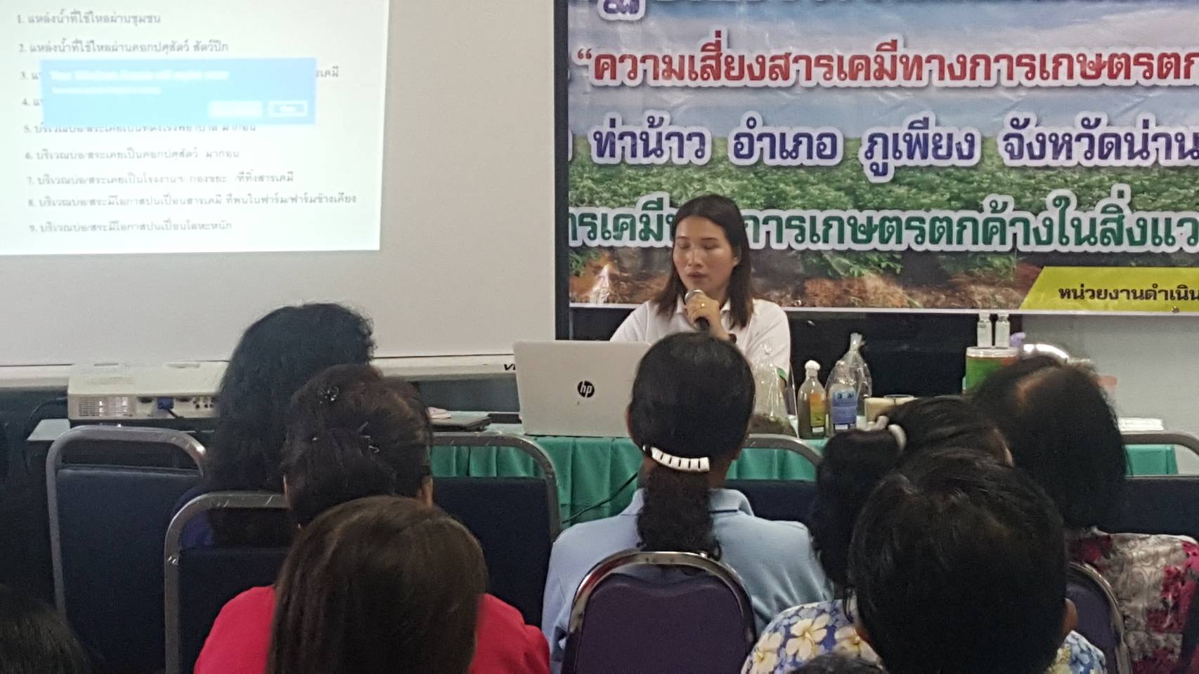 วันที่ 7 สิงหาคม 2561 สำนักงานเกษตรจังหวัดน่าน กลุ่มอารักขาพืช นางสาวกชกร แสนธิวัง นักวิชาการส่งเสริมการเกษตรชำนาญการ เป็นวิทยากรบรรยาย เรื่องการอารักขาพืชเพื่อความปลอดภัยต่อผู้ใช้และผู้บริโภคตามมาตรฐานสากล โครงการแก้ไขปัญหาสารเคมีทางการเกษตรตกค้างในสิ่งแวดล้อมจังหวัดน่าน บูรณาการงานพัฒนาชุมชนจัดการสุขภาวะแบบมีส่วนร่วมตามหลักปรัชญาเศรษฐกิจพอเพียง ณ ห้องประชุมโรงพยาบาลส่งเสริมสุขภาพชุมชนตำบลท่าน้าว อำเภอภูเพียง จังหวัดน่าน