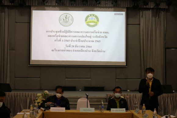 นายรัฐภูมิ ขันสลี ประธานคณะกรรมการแปลงใหญ่จังหวัดน่าน และนายเกษม รุณใจ ประธานคณะกรรมการศูนย์เรียนรู้การเพิ่มประสิทธิภาพการผลิตสินค้าเกษตร (ศพก.) จังหวัดน่าน ดำเนินการประชุมในเรื่องแนวทางการดำเนินงานคณะกรรมการเครือข่าย ศพก. และแปลงใหญ่ การดำเนินงานพัฒนาศักยภาพศูนย์เรียนรู้การเพิ่มประสิทธิภาพการผลิตสินค้าเกษตร (ศพก.) หลัก และเครือข่าย ปี 2565 รายงานการดำเนินงานโครงการระบบส่งเสริมการเกษตรแบบแปลงใหญ่ ปี 2565 ความก้าวหน้าการดำเนินงานโครงการยกระดับแปลงใหญ่ด้วยเกษตรสมัยใหม่ และแผนบูรณาการขับเคลื่อนการดำเนินงาน ศพก./แปลงใหญ่ จังหวัดน่าน ปี 2565