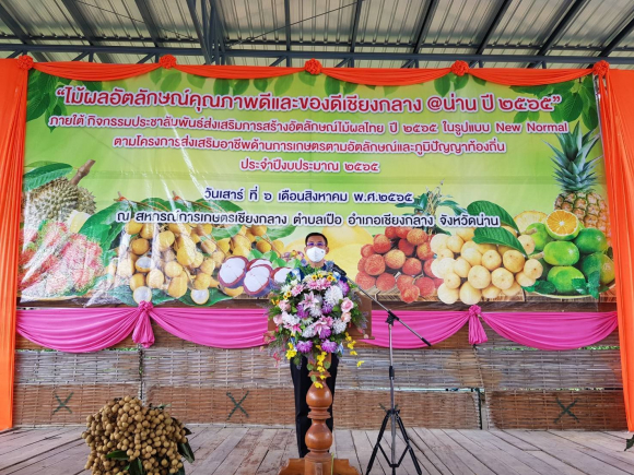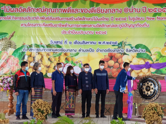 วันที่ 6 สิงหาคม 2565 นายวิบูรณ์ แววบัณฑิต ผู้ว่าราชการจังหวัดน่าน เป็นประธานในพิธีเปิดงานไม้ผลอัตลักษณ์คุณภาพดีและของดีเชียงกลาง@น่าน ปี 2565 ณ สหกรณ์การเกษตรเชียงกลาง ตำบลเปือ อำเภอเชียงกลาง จังหวัดน่าน มี นายชนินทร์ พันธุ์เหม นายอำเภอเชียงกลาง กล่าวต้อนรับ และ นายศักดิ์สิทธิ์ ศรีวิชัย เกษตรจังหวัดน่าน กล่าวรายงานการจัดงานไม้ผลอัตลักษณ์คุณภาพดีและของดีเชียงกลาง@น่าน ปี 2565 กิจกรรมประชาสัมพันธ์ส่งเสริมการสร้างอัตลักษณ์ไม้ผลไทย โครงการส่งเสริมอาชีพด้านการเกษตรตามอัตลักษณ์และภูมิปัญญาท้องถิ่นประจำปีงบประมาณ พ.ศ. 2565