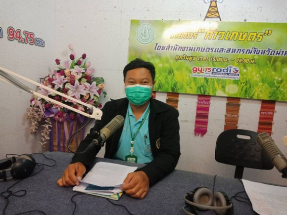 วันที่ 31 สิงหาคม 2565 เวลา 15.00 น. นายศักดิ์สิทธิ์ ศรีวิชัย เกษตรจังหวัดน่าน มอบหมายให้ นายนพรัตน์ จิโน นักวิชาการส่งเสริมการเกษตรชำนาญการ กลุ่มยุทธศาสตร์และสารสนเทศ และ นางสาวณัฐฐิกา เสวกะ นักวิชาการส่งเสริมการเกษตรปฏิบัติการ กลุ่มส่งเสริมและพัฒนาเกษตรกร สำนักงานเกษตรจังหวัดน่าน ร่วมออกรายการวิทยุ "ก้าวเกษตรของจังหวัดน่าน" ทางสถานีวิทยุกระจายเสียงแห่งประเทศไทยจังหวัดน่าน (FM 94.75 Mhz) ดำเนินรายการโดย นางสาวมณีรัตน์ ดาราช หัวหน้ากลุ่มสารสนเทศการเกษตร สำนักงานเกษตรและสหกรณ์จังหวัดน่าน เพื่อประชาสัมพันธ์การขึ้นทะเบียนและปรับปรุงทะเบียนเกษตรกร มาตรการช่วยเหลือเกษตรกรกรณีเกิดภัยพิบัติ และผลการให้ความช่วยเหลือเกษตรกรผู้ประสบภัยพิบัติด้านพืช (อุทกภัย น้ำป่าไหลหลาก เนื่องจากอิทธิพลพายุ “มู่หลาน”) ณ สถานีวิทยุกระจายเสียงแห่งประเทศไทยจังหวัดน่าน