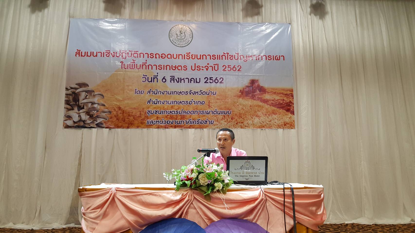วันที่ 6 สิงหาคม 2562 สำนักงานเกษตรจังหวัดน่าน กลุ่มอารักขาพืช จัดสัมมนาเชิงปฏิบัติการถอดบทเรียนการสร้างชุมชนเกษตรปลอดการเผาต้นแบบ ร่วมกับชุมชนต้นแบบปลอดการเผา 15 ชุมชน หน่วยงานภาคีเครือข่ายกระทรวงเกษตรฯ และสำนักงานเกษตรอำเภอ โดยนางพิชยารัชต์ ดิฐภักดีคุณานนท์ หัวหน้ากลุ่มอารักขาพืชให้แนวทางการสัมนาฯ เพื่อสรุปผลสัมฤทธิ์ในการแก้ไขปัญหาการเผาในพื้นที่การเกษตร และสร้างแผนกิจกรรมของชุมชนในการขับเคลื่อนนโยบายการส่งเสริมหยุดการเผาในพื้นที่การเกษตรโดยได้แลกเปลี่ยนเรียนรู้ วิธีการขับเคลื่อนระหว่างชุมชนเกษตรปลอดการเผาต้นแบบ ทั้ง 15 ชุมชน ณ โรงแรมดิอิมเพรสน่าน อำเภอเมือง จังหวัดน่าน