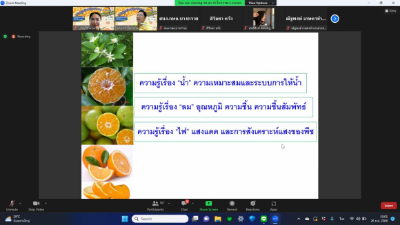 นายศักดิ์สิทธิ์ ศรีวิชัย เกษตรจังหวัดน่าน มอบหมายให้นางสาวบุณยวีร์ ชาวแพะ นักวิชาการส่งเสริมการเกษตรปฏิบัติการ กลุ่มอารักขาพืช นายสุขสันต์ วงกุนะ นักวิชาการส่งเสริมการเกษตรปฏิบัติการ กลุ่มส่งเสริมและพัฒนาการผลิต สำนักงานเกษตรจังหวัดน่าน ร่วมกับเจ้าหน้าที่สำนักงานเกษตรอำเภอทุ่งช้าง และเจ้าหน้าที่สำนักงานเกษตรอำเภอเมืองน่าน จังหวัดน่าน เข้าร่วมอบรมเชิงปฏิบัติการถ่ายทอดความรู้ให้แก่เจ้าหน้าที่ หลักสูตร การจัดการศัตรูส้มด้วยวิธีผสมผสาน ภายใต้โครงการเฝ้าระวังสารเคมีตกค้างในผลผลิตส้ม ผ่านระบบออนไลน์ Zoom Meeting โดยมีนายรพีทัศน์ อุ่นจิตตพันธ์ รองอธิบดีกรมส่งเสริมการเกษตรกล่าวเปิดการอบรม