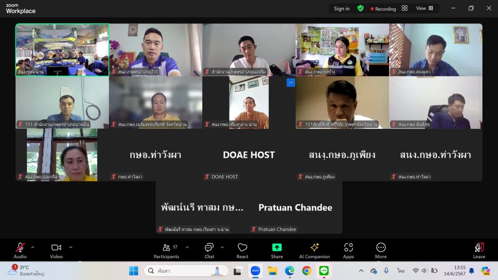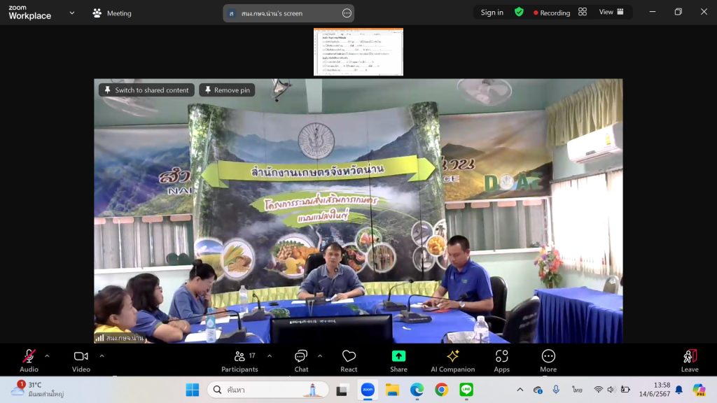 วันที่ 14 มิถุนายน 2567 เวลา 13.30 น. นายกฤษณายุทธ ณ น่าน เกษตรอำเภอปัว พร้อมด้วย นางสาวนิตยา แซ่โซ้ง นักวิชาการส่งเสริมการเกษตรชำนาญการ เข้าร่วมประชุมออนไลน์ผ่านทางแอปพลิเคชั่น Zoom เรื่องการพิจารณาพื้นที่การปรับเปลี่ยนการปลูกพืช ณ สำนักงานเกษตรอำเภอปัว จังหวัดน่าน