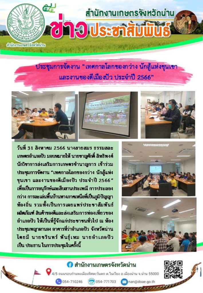 วันที่ 12 – 13 มิถุนายน 2567 นายกฤษณายุทธ ณ น่าน เกษตรอำเภอปัว พร้อมด้วย เจ้าหน้าที่สำนักงานเกษตรอำเภอปัว เข้าร่วมอบรมโครงการเกษตรปลอดภัยและมูลค่าสูง กิจกรรมหลัก พัฒนากระบวนการผลิตสินค้าเกษตรปลอดภัยและเกษตรยั่งยืนด้วยองค์ความรู้ เทคโนโลยีและนวัตกรรม กิจกรรมตามแผนปฏิบัติราชการประจำปีของจังหวัดน่าน ประจำปีงบประมาณ พ.ศ.2567 เป้าหมายเกษตรกร 40 ราย ณ หอประชุมบ้านปางยาง หมู่ที่ 1 ตำบลภูคา อำเภอปัว จังหวัดน่าน โดยมีวิทยากรจากมหาวิทยาลัยเทคโนโลยีราชมงคลล้านนาน่าน และวิทยากรจากสถานีพัฒนาที่ดินน่าน