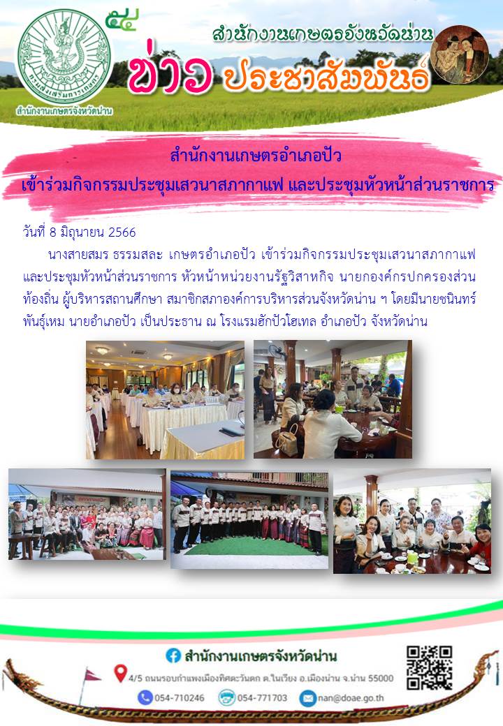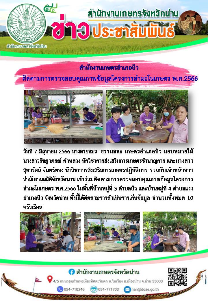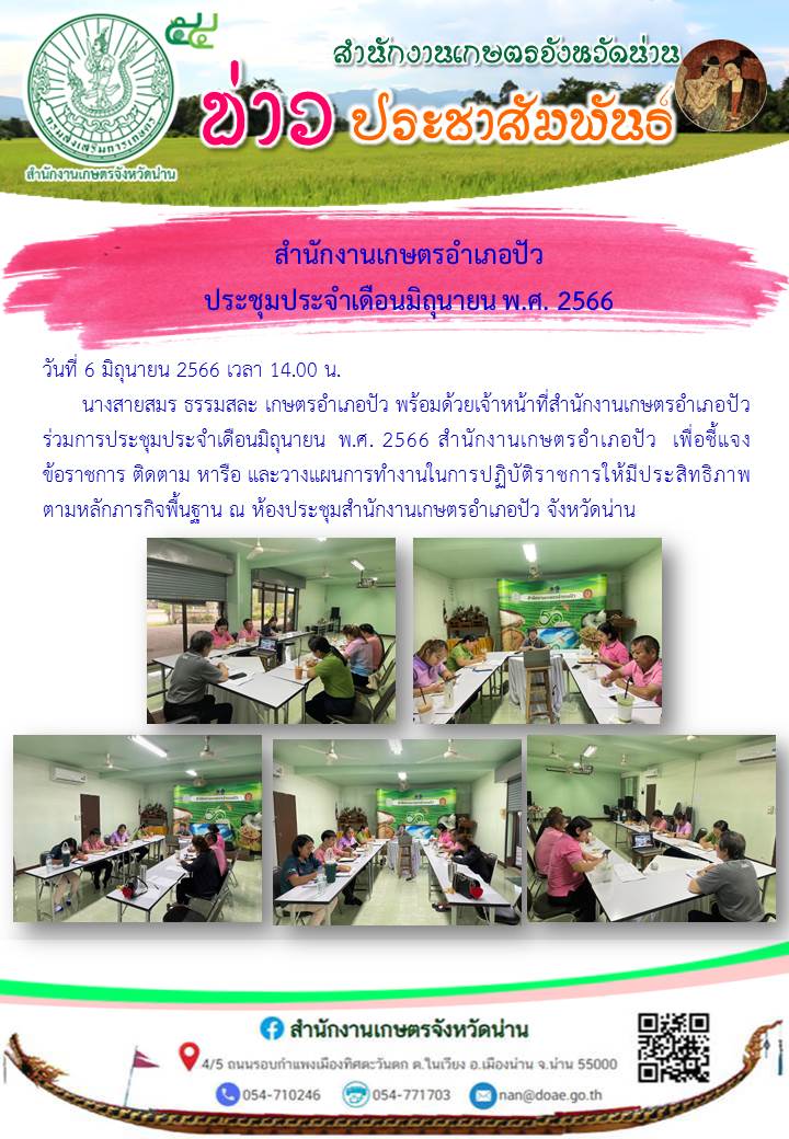 8 มิถุนายน 2566 เวลา 09.00 น. นางสายสมร ธรรมสละ เกษตรอำเภอปัว มอบหมายให้นางสาวแสงรวี ไชยโย นักวิชาการส่งเสริมการเกษตรปฏิบัติการ และนางสาวสุดารัตน์ จันทร์ทอง นักวิชาการส่งเสริมการเกษตรปฏิบัติการ ลงพื้นที่ถ่ายทอดความรู้เรื่อง “การผลิตสารซีวภัณฑ์ (เชื้อไตรโคเดอร์ม่า)” โครงการขยายและส่งเสริมการใช้เชื้อจุลินทรีย์ (ไตรโคเดอร์ม่า) ในการป้องกันและกำจัดโรคพืช ณ ห้องประชุมองค์การบริหารส่วนตำบลวรนคร อำเภอปัว จังหวัดน่าน