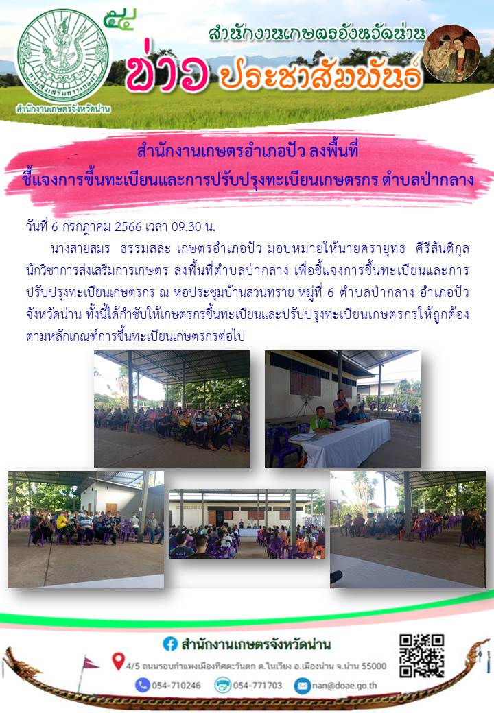 วันที่ 6 กรกฎาคม 2566 เวลา 09.30 น. นางสายสมร ธรรมสละ เกษตรอำเภอปัว มอบหมายให้นายศรายุทธ คีรีสันติกุล นักวิชาการส่งเสริมการเกษตร ลงพื้นที่ตำบลป่ากลาง เพื่อชี้แจงการขึ้นทะเบียนและการปรับปรุงทะเบียนเกษตรกร ณ หอประชุมบ้านสวนทราย หมู่ที่ 6 ตำบลป่ากลาง อำเภอปัว จังหวัดน่าน ทั้งนี้ได้กำชับให้เกษตรกรขึ้นทะเบียนและปรับปรุงทะเบียนเกษตรกรให้ถูกต้องตามหลักเกณฑ์การขึ้นทะเบียนเกษตรกรต่อไป
