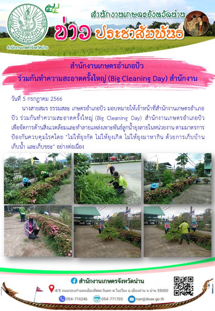 วันที่ 5 กรกฎาคม 2566 นางสายสมร ธรรมสละ เกษตรอำเภอปัว มอบหมายให้เจ้าหน้าที่สำนักงานเกษตรอำเภอปัว ร่วมกันทำความสะอาดครั้งใหญ่ (Big Cleaning Day) สำนักงานเกษตรอำเภอปัว เพื่อจัดการด้านสิ่งแวดล้อมและทำลายแหล่งเพาะพันธ์ลูกน้ำยุงลายในหน่วยงาน ตามมาตรการป้องกันควบคุมโรคโดย “ไม่ให้ยุงกัด ไม่ให้ยุงเกิด ไม่ให้ยุงมาหากิน ด้วยการเก็บบ้าน เก็บน้ำและเก็บขยะ” อย่างต่อเนื่อง
