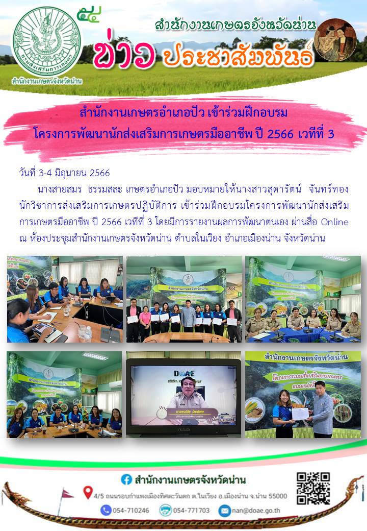 เข้าร่วมฝึกอบรมโครงการพัฒนานักส่งเสริมการเกษตรมืออาชีพ ปี 2566 เวทีที่ 3 โดยมีการรายงานผลการพัฒนาตนเอง ผ่านสื่อ Online ณ ห้องประชุมสำนักงานเกษตรจังหวัดน่าน ตำบลในเวียง อำเภอเมืองน่าน จังหวัดน่าน