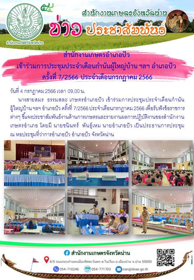 เกษตรอำเภอปัว เข้าร่วมการประชุมประจำเดือนกำนัน ผู้ใหญ่บ้าน ฯลฯ อำเภอปัว ครั้งที่ 7/2566 ประจำเดือนกรกฎาคม 2566