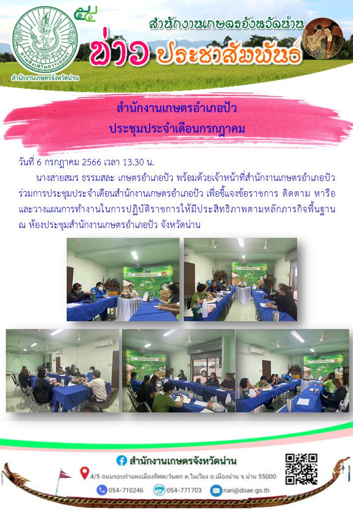 เกษตรอำเภอปัว พร้อมด้วยเจ้าหน้าที่สำนักงานเกษตรอำเภอปัว ร่วมการประชุมประจำเดือนกรกฎาคม 2566 เพื่อชี้แจงข้อราชการ ติดตาม หารือ และวางแผนการทำงานในการปฏิบัติราชการ