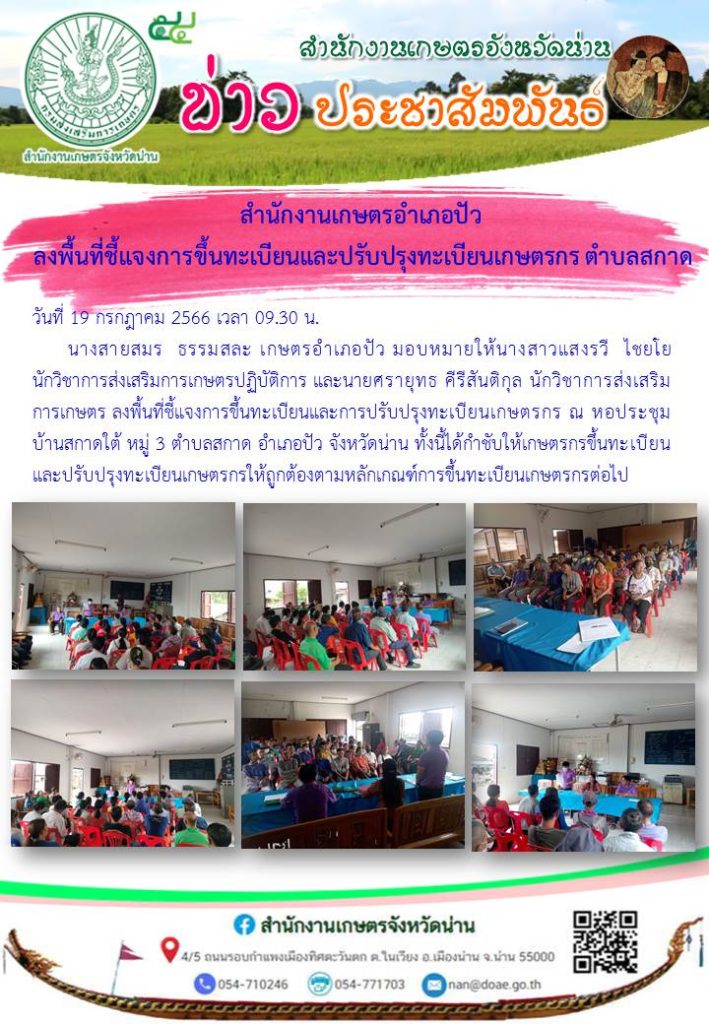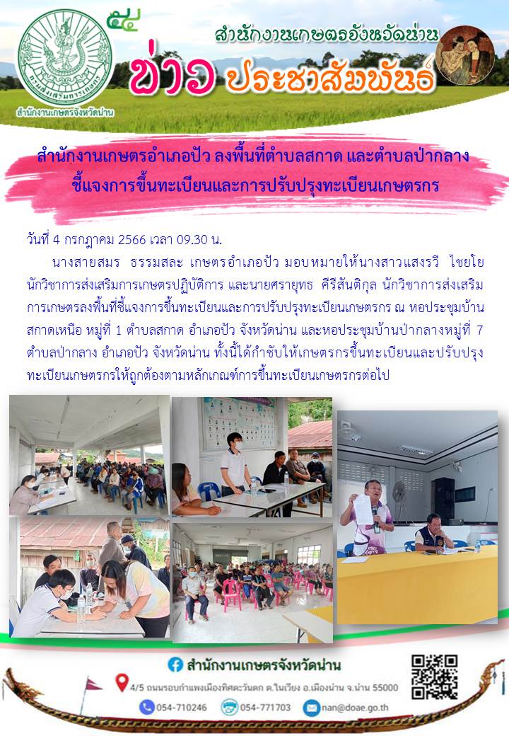 วันที่ 4 กรกฎาคม 2566 เวลา 09.30 น. นางสายสมร ธรรมสละ เกษตรอำเภอปัว มอบหมายให้นางสาวแสงรวี ไชยโย นักวิชาการส่งเสริมการเกษตรปฏิบัติการ และนายศรายุทธ คีรีสันติกุล นักวิชาการส่งเสริมการเกษตรลงพื้นที่ชี้แจงการขึ้นทะเบียนและการปรับปรุงทะเบียนเกษตรกร ณ หอประชุมบ้านสกาดเหนือ หมู่ที่ 1 ตำบลสกาด อำเภอปัว จังหวัดน่าน และหอประชุมบ้านป่ากลางหมู่ที่ 7 ตำบลป่ากลาง อำเภอปัว จังหวัดน่าน ทั้งนี้ได้กำชับให้เกษตรกรขึ้นทะเบียนและปรับปรุงทะเบียนเกษตรกรให้ถูกต้องตามหลักเกณฑ์การขึ้นทะเบียนเกษตรกรต่อไป