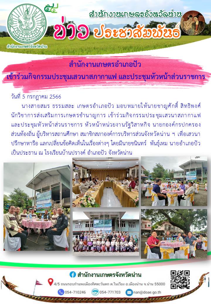 วันที่ 5 กรกฎาคม 2566 นางสายสมร ธรรมสละ เกษตรอำเภอปัว มอบหมายให้นายชาญศักดิ์ สิทธิพงศ์ นักวิชาการส่งเสริมการเกษตรชำนาญการ เข้าร่วมกิจกรรมประชุมเสวนาสภากาแฟ และประชุมหัวหน้าส่วนราชการ หัวหน้าหน่วยงานรัฐวิสาหกิจ นายกองค์กรปกครองส่วนท้องถิ่น ผู้บริหารสถานศึกษา สมาชิกสภาองค์การบริหารส่วนจังหวัดน่าน ฯ เพื่อเสวนาปรึกษาหารือ แลกเปลี่ยนข้อคิดเห็นในเรื่องต่างๆ โดยมีนายชนินทร์ พันธุ์เหม นายอำเภอปัว เป็นประธาน ณ โรงเรียนบ้านปรางค์ อำเภอปัว จังหวัดน่าน