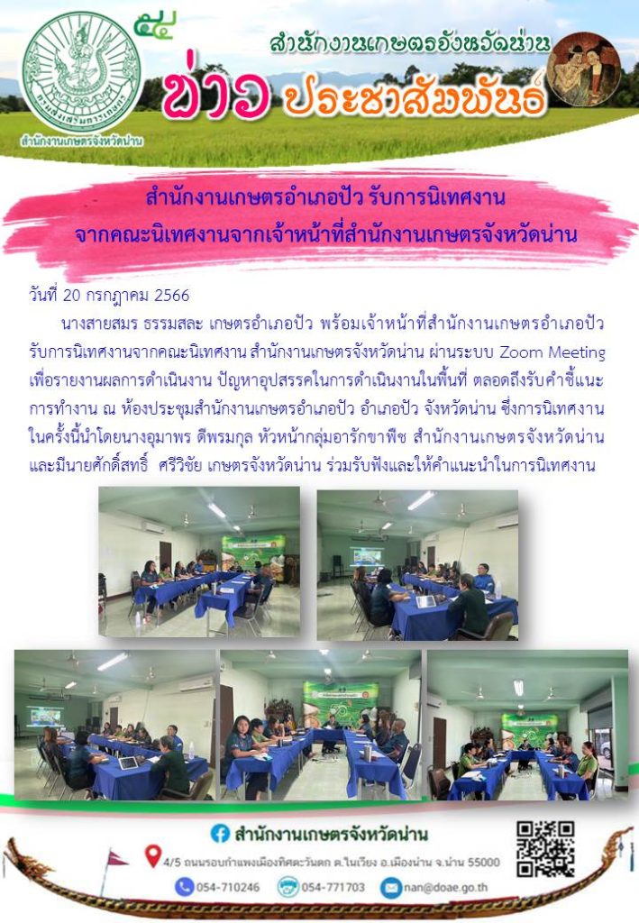 วันที่ 20 กรกฎาคม 2566 นางสายสมร ธรรมสละ เกษตรอำเภอปัว พร้อมเจ้าหน้าที่สำนักงานเกษตรอำเภอปัว รับการนิเทศงานจากคณะนิเทศงาน สำนักงานเกษตรจังหวัดน่าน ผ่านระบบ Zoom Meeting เพื่อรายงานผลการดำเนินงาน ปัญหาอุปสรรคในการดำเนินงานในพื้นที่ ตลอดถึงรับคำชี้แนะการทำงาน ณ ห้องประชุมสำนักงานเกษตรอำเภอปัว อำเภอปัว จังหวัดน่าน ซึ่งการนิเทศงานในครั้งนี้นำโดยนางอุมาพร ดีพรมกุล หัวหน้ากลุ่มอารักขาพืช สำนักงานเกษตรจังหวัดน่าน และมีนายศักดิ์สทธิ์ ศรีวิชัย เกษตรจังหวัดน่าน ร่วมรับฟังและให้คำแนะนำในการนิเทศงาน