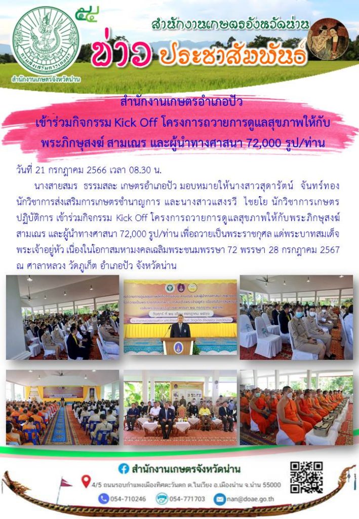 วันที่ 21 กรกฎาคม 2566 เวลา 08.30 น. นางสายสมร ธรรมสละ เกษตรอำเภอปัว มอบหมายให้นางสาวสุดารัตน์ จันทร์ทอง นักวิชาการส่งเสริมการเกษตรชำนาญการ และนางสาวแสงรวี ไชยโย นักวิชาการเกษตรปฏิบัติการ เข้าร่วมกิจกรรม Kick Off โครงการถวายการดูแลสุขภาพให้กับพระภิกษุสงฆ์ สามเณร และผู้นำทางศาสนา 72,000 รูป/ท่าน เพื่อถวายเป็นพระราชกุศล แด่พระบาทสมเด็จพระเจ้าอยู่หัว เนื่องในโอกาสมหามงคลเฉลิมพระชนมพรรษา 72 พรรษา 28 กรกฎาคม 2567 ณ ศาลาหลวง วัดภูเก็ต อำเภอปัว จังหวัดน่าน