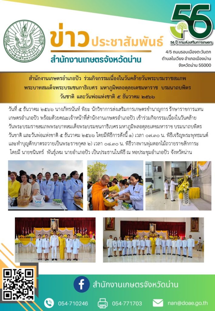 วันที่ 5 ธันวาคม 2566 นางภัทรนันท์ พิยะ นักวิชาการส่งเสริมการเกษตรชำนาญการ รักษาราชการแทน เกษตรอำเภอปัว พร้อมด้วยคณะเจ้าหน้าที่สำนักงานเกษตรอำเภอปัว เข้าร่วมกิจกรรมเนื่องในวันคล้ายวันพระบรมราชสมภพพระบาทสมเด็จพระบรมชนกาธิเบศร มหาภูมิพลอดุลยเดชมหาราช บรมนาถบพิตร วันชาติ และวันพ่อแห่งชาติ 5 ธันวาคม 2566 โดยมีพิธีการดังนี้ 1) เวลา 07.30 น. พิธีเจริญพระพุทธมนต์และทำบุญตักบาตรถวายเป็นพระราชกุศล 2) เวลา 08.30 น. พิธีวางพานพุ่มดอกไม้ถวายราชสักการะโดยมี นายชนินทร์ พันธุ์เหม นายอำเภอปัว เป็นประธานในพิธี ณ หอประชุมอำเภอปัว จังหวัดน่าน