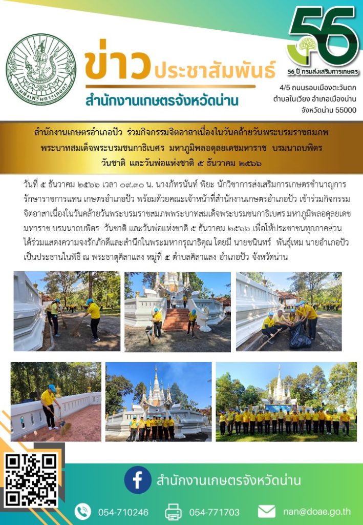 วันที่ 5 ธันวาคม 2566 เวลา 09.30 น. นางภัทรนันท์ พิยะ นักวิชาการส่งเสริมการเกษตรชำนาญการ รักษาราชการแทน เกษตรอำเภอปัว พร้อมด้วยคณะเจ้าหน้าที่สำนักงานเกษตรอำเภอปัว เข้าร่วมกิจกรรมจิตอาสาเนื่องในวันคล้ายวันพระบรมราชสมภพพระบาทสมเด็จพระบรมชนกาธิเบศร มหาภูมิพลอดุลยเดชมหาราช บรมนาถบพิตร วันชาติ และวันพ่อแห่งชาติ 5 ธันวาคม 2566 เพื่อให้ประชาชนทุกภาคส่วน ได้ร่วมแสดงความจงรักภักดีและสำนึกในพระมหากรุณาธิคุณ โดยมี นายชนินทร์ พันธุ์เหม นายอำเภอปัว เป็นประธานในพิธี ณ พระธาตุศิลาแลง หมู่ที่ 5 ตำบลศิลาแลง อำเภอปัว จังหวัดน่าน