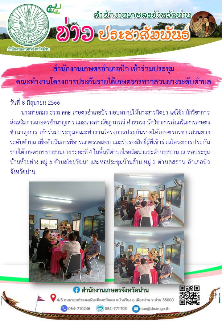 8 มิถุนายน 2566 นางสายสมร ธรรมสละ เกษตรอำเภอปัว มอบหมายให้นางสาวนิตยา แซ่โซ้ง นักวิชาการส่งเสริมการเกษตรชำนาญการ และนางสาวรัชฎาภรณ์ คำหลวง นักวิชาการส่งเสริมการเกษตรชำนาญการ เข้าร่วมประชุมคณะทำงานโครงการประกันรายได้เกษตรกรชาวสวนยางระดับตำบล เพื่อดำเนินการพิจารณาตรวจสอบ และรับรองสิทธิ์ผู้ที่เข้าร่วมโครงการประกันรายได้เกษตรกรชาวสวนยาง ระยะที่ 4 ในพื้นที่ตำบลไชยวัฒนาและตำบลสถาน ณ หอประชุมบ้านห้วยท่าง หมู่ 5 ตำบลไชยวัฒนา และหอประชุมบ้านส้าน หมู่ 2 ตำบลสถาน อำเภอปัว จังหวัดน่าน