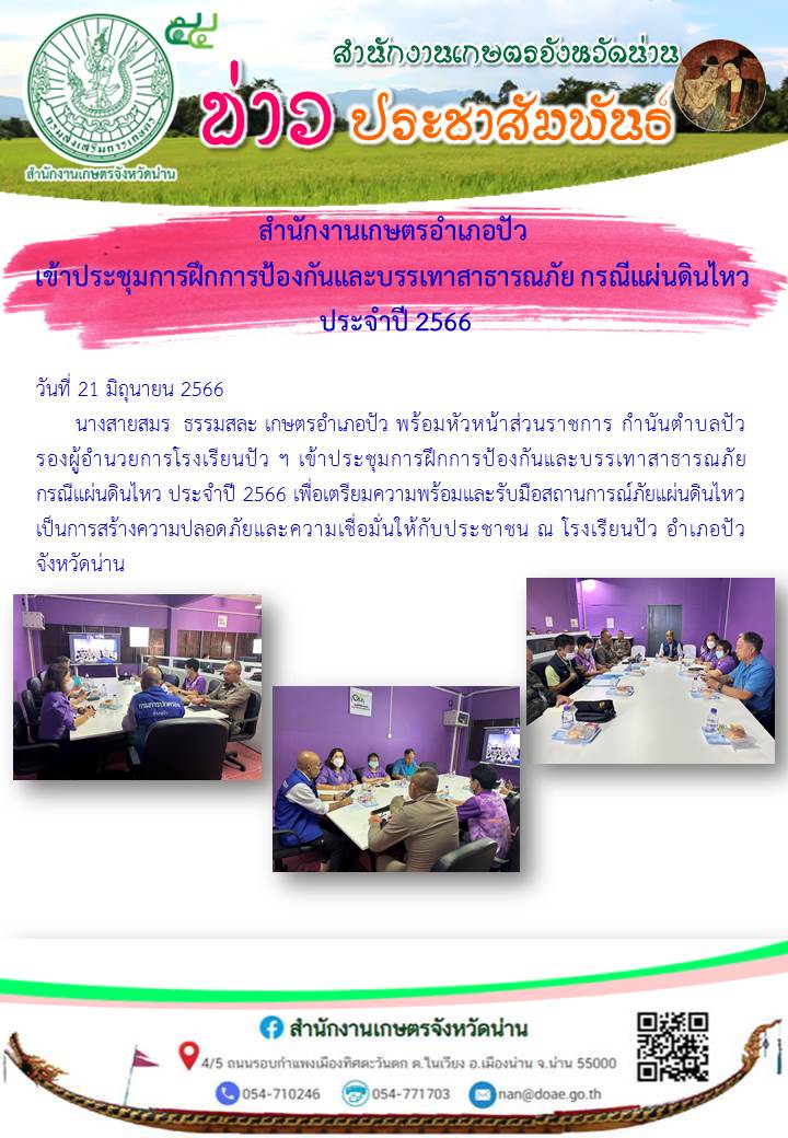 วันที่ 21 มิถุนายน 2566 นางสายสมร ธรรมสละ เกษตรอำเภอปัว พร้อมหัวหน้าส่วนราชการ กำนันตำบลปัว รองผู้อำนวยการโรงเรียนปัว ฯ เข้าประชุมการฝึกการป้องกันและบรรเทาสาธารณภัย กรณีแผ่นดินไหว ประจำปี 2566 เพื่อเตรียมความพร้อมและรับมือสถานการณ์ภัยแผ่นดินไหว เป็นการสร้างความปลอดภัยและความเชื่อมั่นให้กับประชาชน ณ โรงเรียนปัว อำเภอปัว จังหวัดน่าน