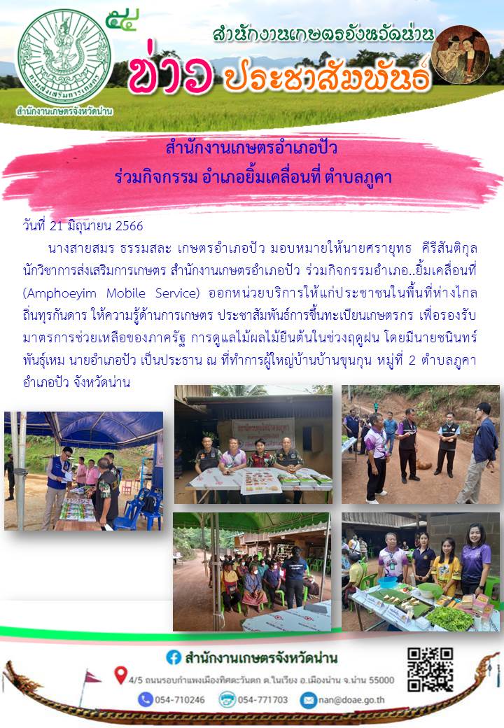 วันที่ 21 มิถุนายน 2566 นางสายสมร ธรรมสละ เกษตรอำเภอปัว มอบหมายให้นายศรายุทธ คีรีสันติกุล นักวิชาการส่งเสริมการเกษตร สำนักงานเกษตรอำเภอปัว ร่วมกิจกรรมอำเภอ..ยิ้มเคลื่อนที่ (Amphoeyim Mobile Service) ออกหน่วยบริการให้แก่ประชาชนในพื้นที่ห่างไกลถิ่นทุรกันดาร ให้ความรู้ด้านการเกษตร ประชาสัมพันธ์การขึ้นทะเบียนเกษตรกร เพื่อรองรับมาตรการช่วยเหลือของภาครัฐ การดูแลไม้ผลไม้ยืนต้นในช่วงฤดูฝน โดยมีนายชนินทร์ พันธุ์เหม นายอำเภอปัว เป็นประธาน ณ ที่ทำการผู้ใหญ่บ้านบ้านขุนกุน หมู่ที่ 2 ตำบลภูคา อำเภอปัว จังหวัดน่าน