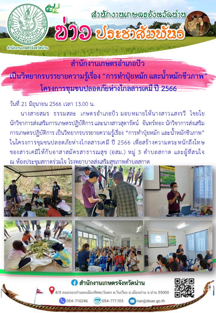 วันที่ 21 มิถุนายน 2566 เวลา 13.00 น. นางสายสมร ธรรมสละ เกษตรอำเภอปัว มอบหมายให้นางสาวแสงรวี ไชยโย นักวิชาการส่งเสริมการเกษตรปฏิบัติการ และนางสาวสุดารัตน์ จันทร์ทอง นักวิชาการส่งเสริมการเกษตรปฏิบัติการ เป็นวิทยากรบรรยายความรู้เรื่อง “การทำปุ๋ยหมัก และน้ำหมักชีวภาพ” ในโครงการชุมชนปลอดภัยห่างไกลสารเคมี ปี 2566 เพื่อสร้างความตระหนักถึงโทษของสารเคมีให้กับอาสาสมัครสาธารณสุข (อสม.) หมู่ 3 ตำบลสกาด และผู้ที่สนใจ ณ ห้องประชุมสกาดร่วมใจ โรงพยาบาลส่งเสริมสุขภาพตำบลสกาด