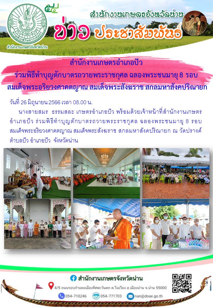 วันที่ 26 มิถุนายน 2566 นางสายสมร ธรรมสละ เกษตรอำเภอปัว พร้อมด้วยเจ้าหน้าที่สำนักงานเกษตรอำเภอปัว ร่วมพิธีทำบุญตักบาตรถวายพระราชกุศล ฉลองพระชนมายุ 8 รอบ สมเด็จพระอริยวงศาคตญาณ สมเด็จพระสังฆราช สกลมหาสังคปริณายก ณ วัดปรางค์ ตำบลปัว อำเภอปัว จังหวัดน่าน