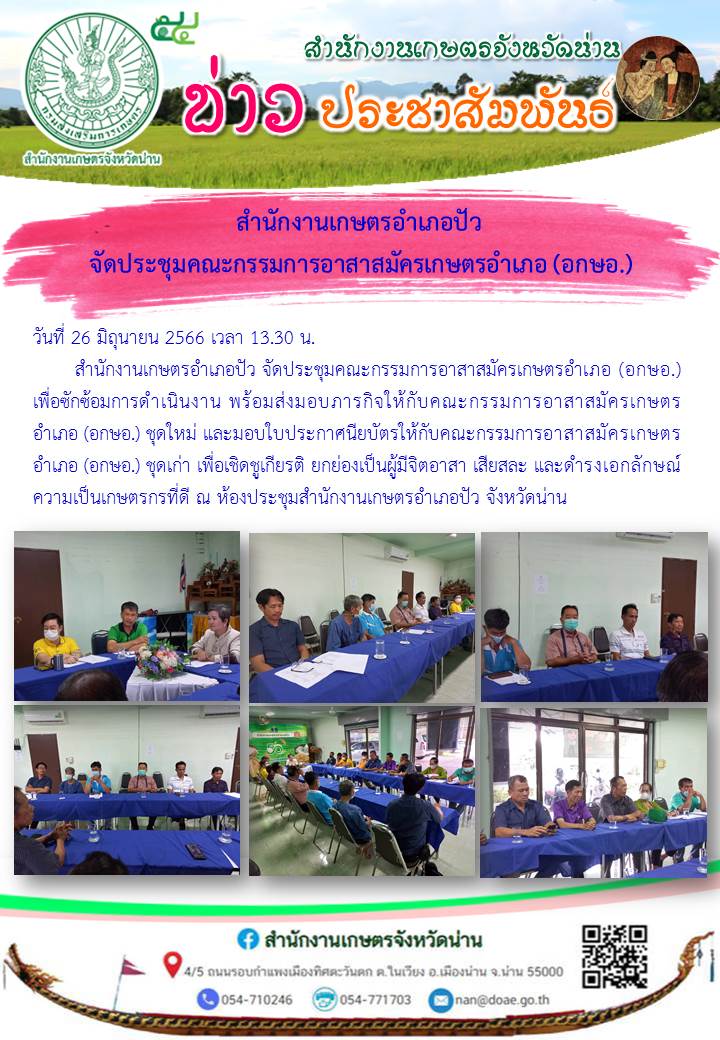 วันที่ 26 มิถุนายน 2566 เวลา 13.30 น. สำนักงานเกษตรอำเภอปัว จัดประชุมคณะกรรมการอาสาสมัครเกษตรอำเภอ (อกษอ.) เพื่อซักซ้อมการดำเนินงาน พร้อมส่งมอบภารกิจให้กับคณะกรรมการอาสาสมัครเกษตรอำเภอ (อกษอ.) ชุดใหม่ และมอบใบประกาศนียบัตรให้กับคณะกรรมการอาสาสมัครเกษตรอำเภอ (อกษอ.) ชุดเก่า เพื่อเชิดชูเกียรติ ยกย่องเป็นผู้มีจิตอาสา เสียสละ และดำรงเอกลักษณ์ความเป็นเกษตรกรที่ดี ณ ห้องประชุมสำนักงานเกษตรอำเภอปัว จังหวัดน่าน