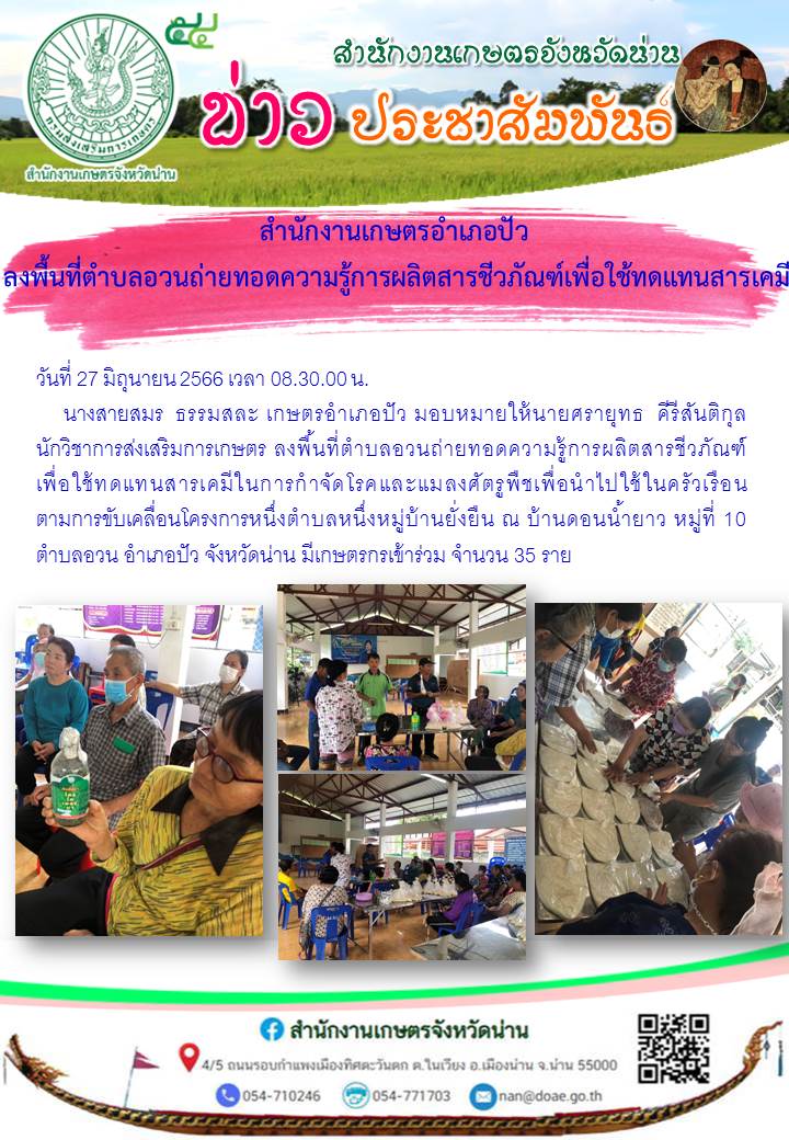 วันที่ 27 มิถุนายน 2566 เวลา 08.30.00 น. นางสายสมร ธรรมสละ เกษตรอำเภอปัว มอบหมายให้นายศรายุทธ คีรีสันติกุล นักวิชาการส่งเสริมการเกษตร ลงพื้นที่ตำบลอวนถ่ายทอดความรู้การผลิตสารชีวภัณฑ์เพื่อใช้ทดแทนสารเคมีในการกำจัดโรคและแมลงศัตรูพืชเพื่อนำไปใช้ในครัวเรือน ตามการขับเคลื่อนโครงการหนึ่งตำบลหนึ่งหมู่บ้านยั่งยืน ณ บ้านดอนน้ำยาว หมู่ที่ 10 ตำบลอวน อำเภอปัว จังหวัดน่าน มีเกษตรกรเข้าร่วม จำนวน 35 ราย