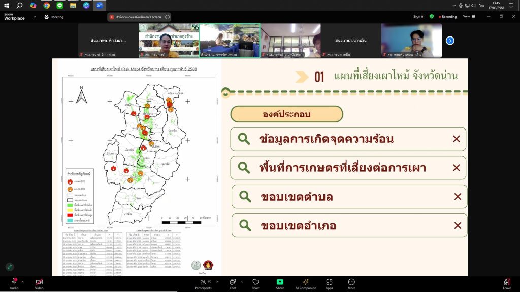 นายสันติ มณีอ่อน เกษตรอำเภอท่าวังผา มอบหมายให้ นายชวลิต ตนะทิพย์ นักวิชาการส่งเสริมการเกษตรปฏิบัติการ ร่วมประชุมชี้แจงแนวทางการดำเนินงานป้องกันและแก้ไขปัญหาไฟป่า จังหวัดน่าน ปี 2568 ผ่านระบบออนไลน์ Zoom Meeting ณ สำนักงานเกษตรอำเภอท่าวังผา จังหวัดน่าน