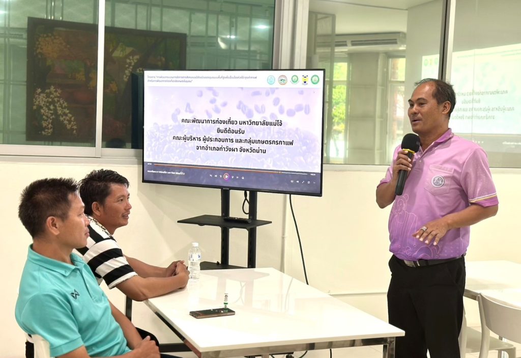 นายสันติ มณีอ่อน เกษตรอำเภอท่าวังผา พร้อมด้วย นางสาวกัญจนพร ไชยวุฒิ นักวิชาการส่งเสริมการเกษตรปฏิบัติการ และกลุ่มเกษตรกรผู้ปลูกกาแฟอำเภอท่าวังผา ร่วมศึกษาดูงานโครงการพัฒนากระบวนการจัดการทางสังคมแบบมีส่วนร่วมของชุมชนบนพื้นที่สูง เพื่อเชื่อมโยงห่วงโซ่คุณค่ากาแฟ สำหรับการพัฒนาการท่องเที่ยวเชิงเกษตรในชุมชน ซึ่งมีวัตถุประสงค์เพื่อเพิ่มประสิทธิภาพการผลิตของผู้ปลูกกาแฟจังหวัดน่านด้วยเทคโนโลยีและนวัตกรรมควบคู่กับการเพิ่มคุณภาพกาแฟตามสายพันธุ์ รวมถึงกระบวนการแปรรูป เพื่อยกระดับศักยภาพเกษตรกรผู้ปลูกกาแฟ โดยมีกิจกรรมการทำปุ๋ยอินทรีย์ไม่กลับกองจากเปลือกกาแฟ ณ ศูนย์เรียนรู้วัฒนธรรมเกษตรล้านนามหาวิทยาลัยแม่โจ้ และศึกษาดูงานเทคโนโลยีการผลิตและการแปรรูปกาแฟ ณ ศูนย์วิจัยเกษตรหลวงเชียงใหม่ (ขุนวาง)
