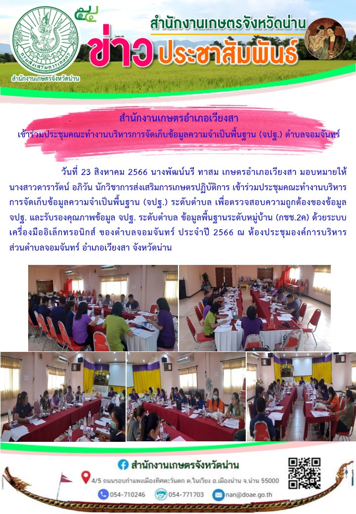 วันที่ 23 สิงหาคม 2566 นางพัฒน์นรี ทาสม เกษตรอำเภอเวียงสา มอบหมายให้ นางสาวดารารัตน์ อภิวัน นักวิชาการส่งเสริมการเกษตรปฏิบัติการ เข้าร่วมประชุมคณะทำงานบริหารการจัดเก็บข้อมูลความจำเป็นพื้นฐาน (จปฐ.) ระดับตำบล เพื่อตรวจสอบความถูกต้องของข้อมูล จปฐ. และรับรองคุณภาพข้อมูล จปฐ. ระดับตำบล ข้อมูลพื้นฐานระดับหมู่บ้าน (กชช.2ค) ด้วยระบบเครื่องมืออิเล็กทรอนิกส์ ของตำบลจอมจันทร์ ประจำปี 2566 ณ ห้องประชุมองค์การบริหารส่วนตำบลจอมจันทร์ อำเภอเวียงสา จังหวัดน่าน