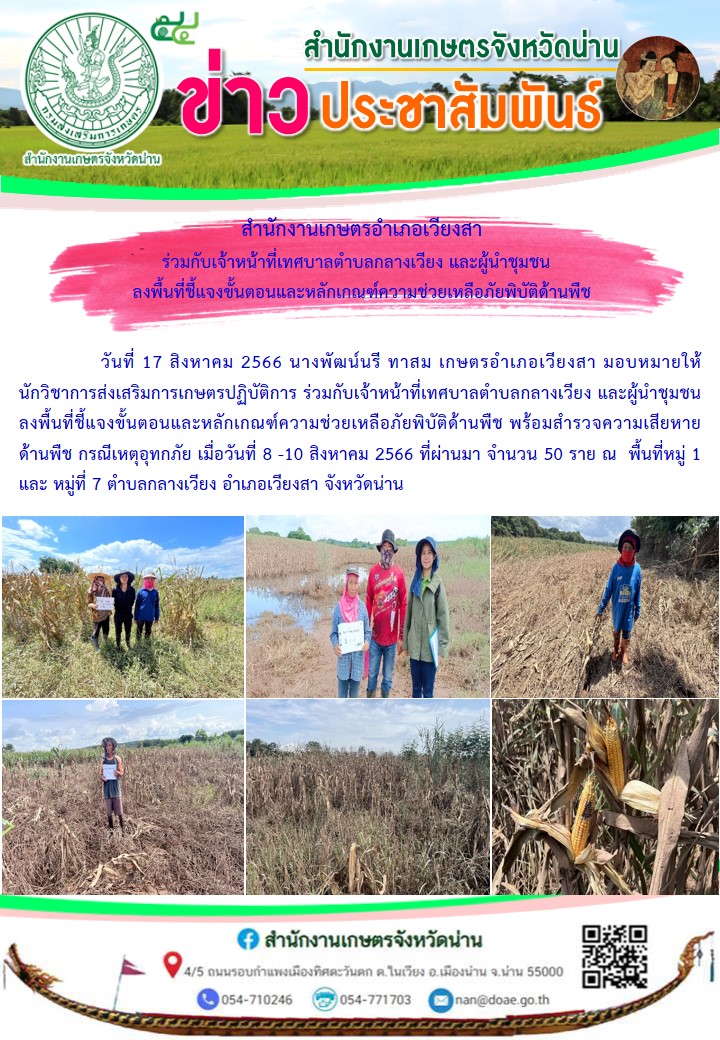 วันที่ 17 สิงหาคม 2566 นางพัฒน์นรี ทาสม เกษตรอำเภอเวียงสา มอบหมายให้นักวิชาการส่งเสริมการเกษตรปฏิบัติการ ร่วมกับเจ้าหน้าที่เทศบาลตำบลกลางเวียงและผู้นำชุมชน ลงพื้นที่ชี้แจงขั้นตอนและหลักเกณฑ์ความช่วยเหลือภัยพิบัติด้านพืช พร้อมสำรวจความเสียหายด้านพืช กรณีเหตุอุทกภัย เมื่อวันที่ 8 -10 สิงหาคม 2566 ที่ผ่านมา จำนวน 50 ราย ณ พื้นที่หมู่ 1 และ หมู่ที่ 7 ตำบลกลางเวียง อำเภอเวียงสา จังหวัดน่าน